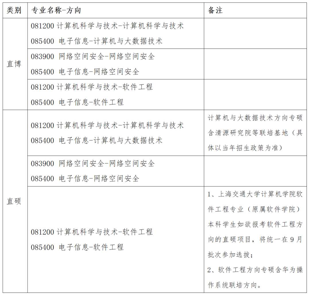 2026级计算机学院研究生“优秀生源”活动面向校内外学生选拔,招生目录见下表。专业学位含联培基地、工程硕博士培养改革专项注等,具体以当年招生政策为准。